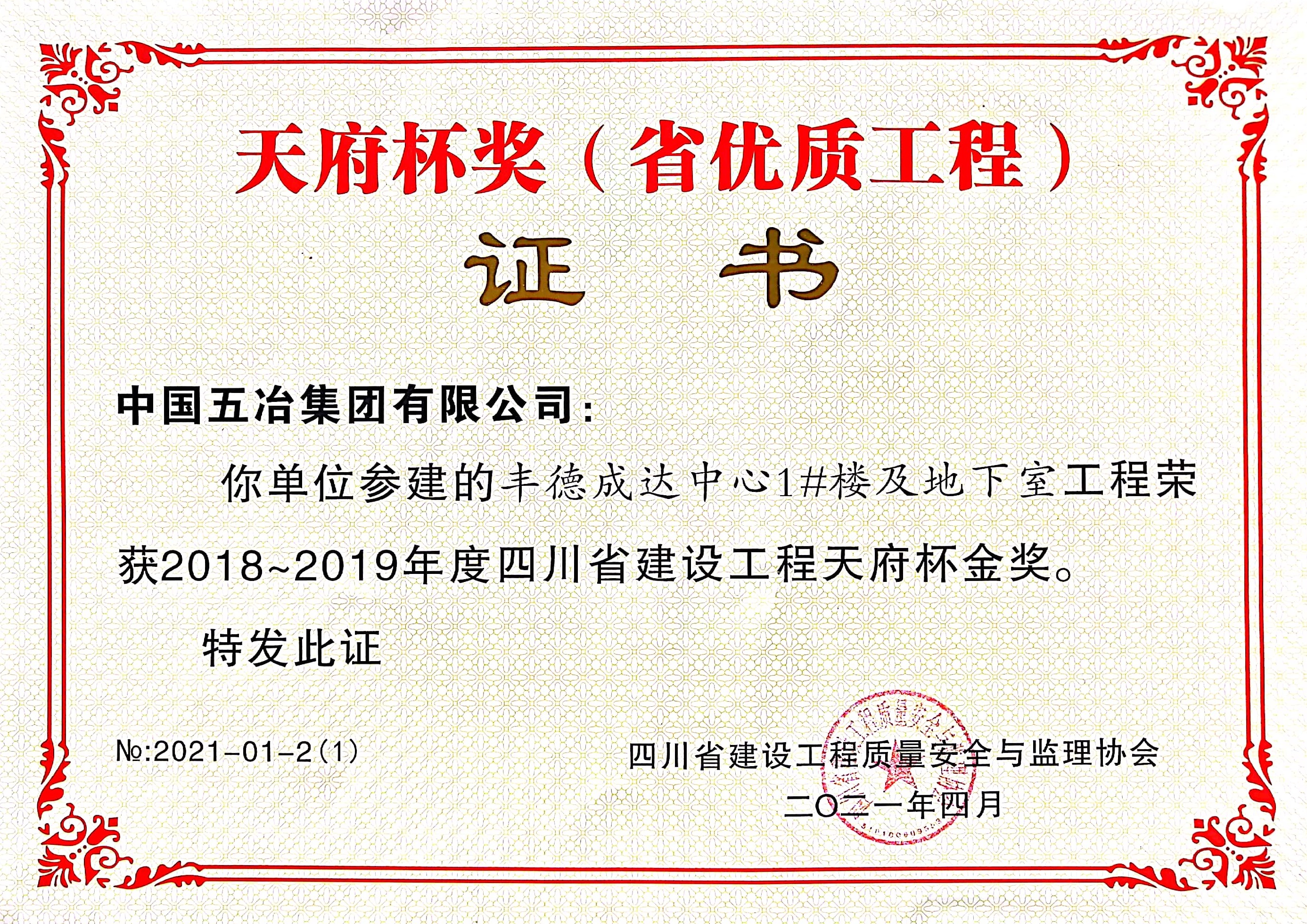 豐德成達(dá)中心1#樓及地下室-2018~2019年度四川省建設(shè)工程天府杯金獎(jiǎng)
