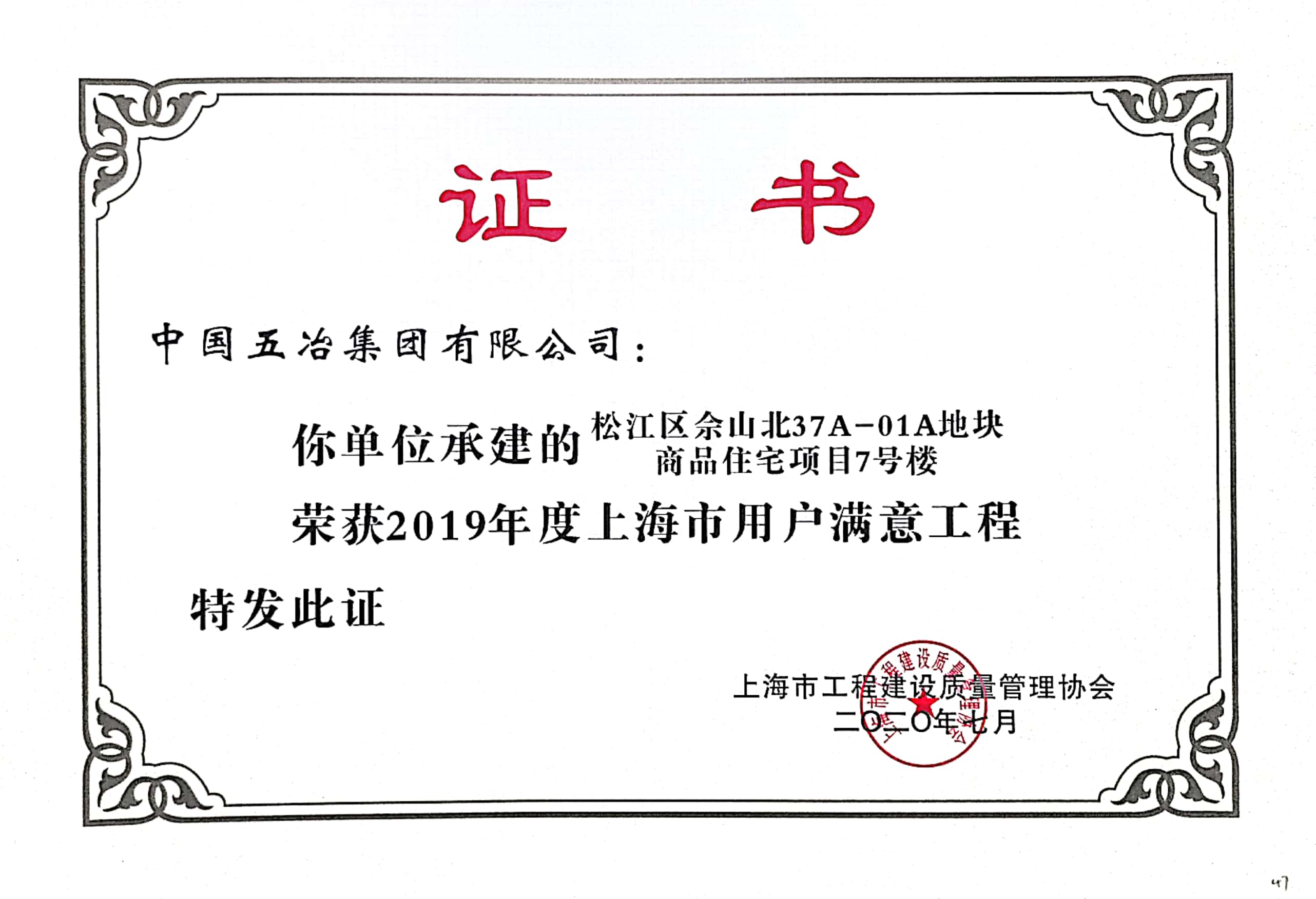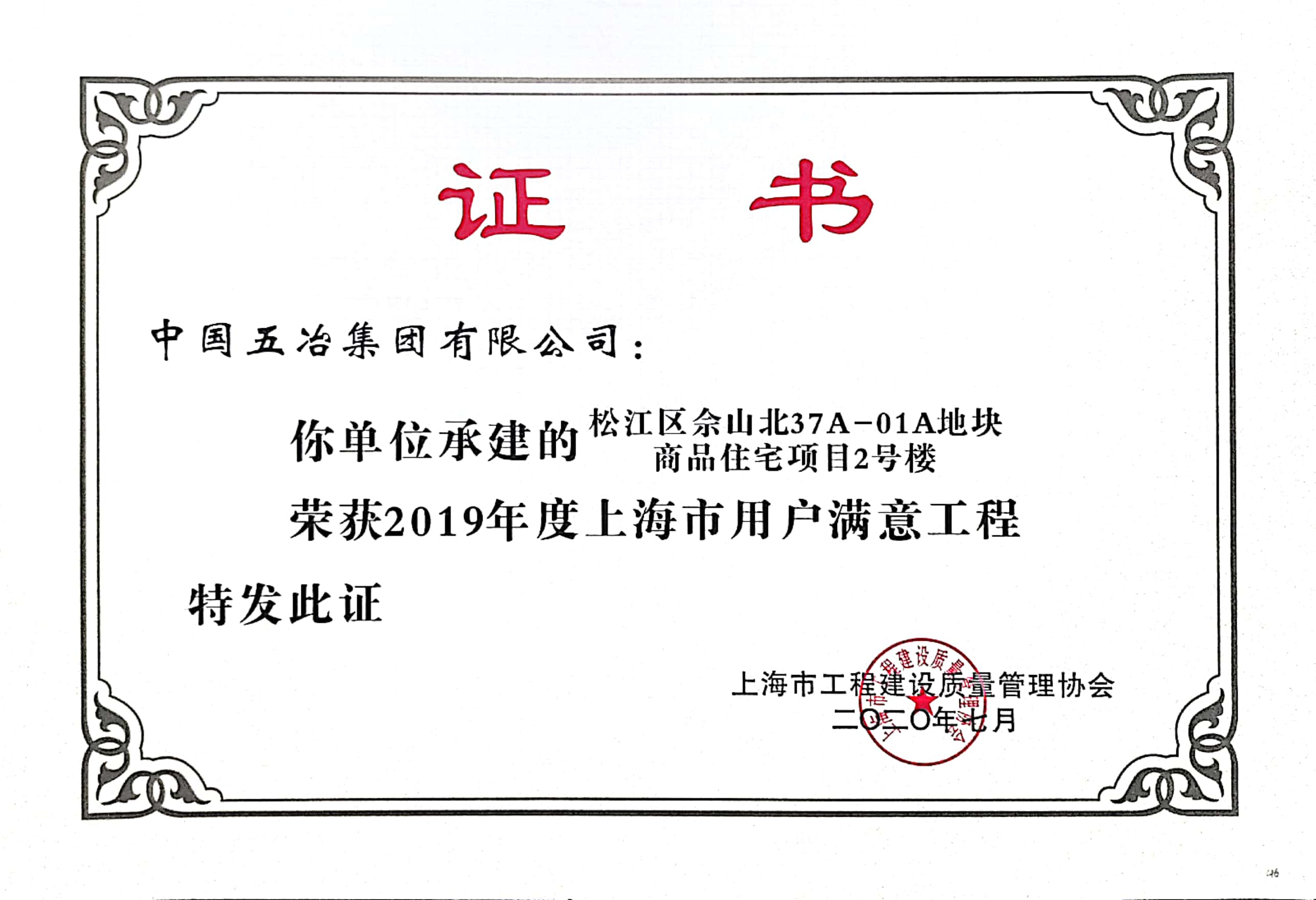 松江區(qū)佘山北37A-01A地塊商品住宅項(xiàng)目7號(hào)樓榮獲2019年度上海市用戶滿意工程