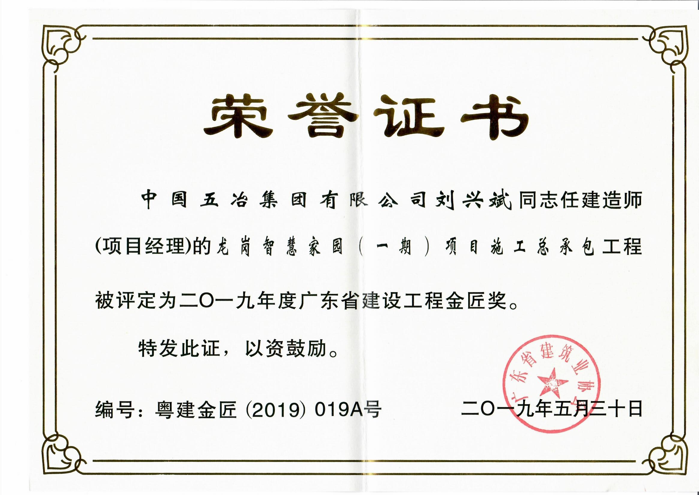 龍崗智慧家園(一期)項(xiàng)目施工總承包工程被評(píng)定為二〇一九年度廣東省建設(shè)工程金匠獎(jiǎng)