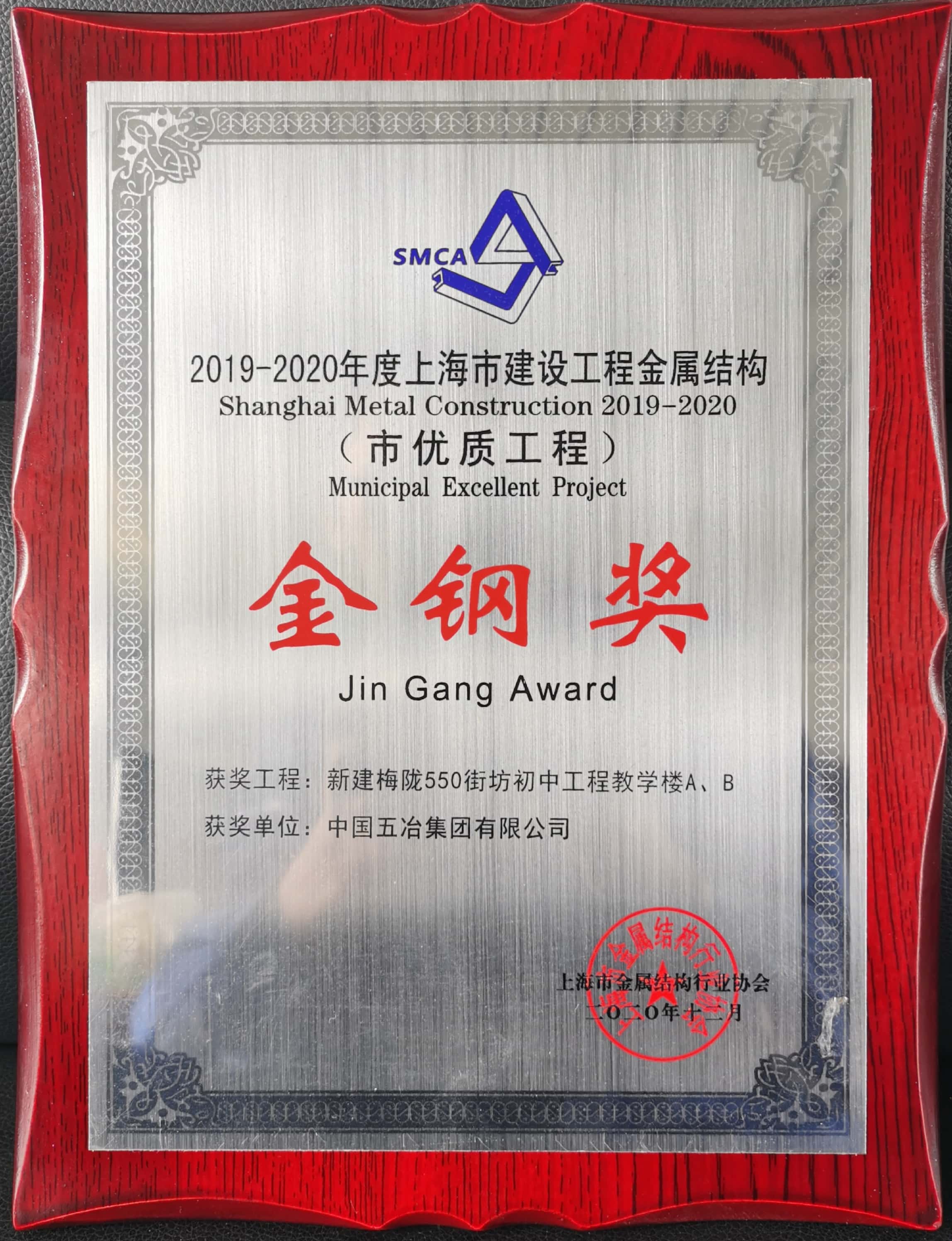 新建梅隴550街坊初中工程教學(xué)樓A、B榮獲2019-2020年度第二批上海市建設(shè)工程金屬結(jié)構(gòu)“金鋼獎(jiǎng)”(市優(yōu)質(zhì)工程)