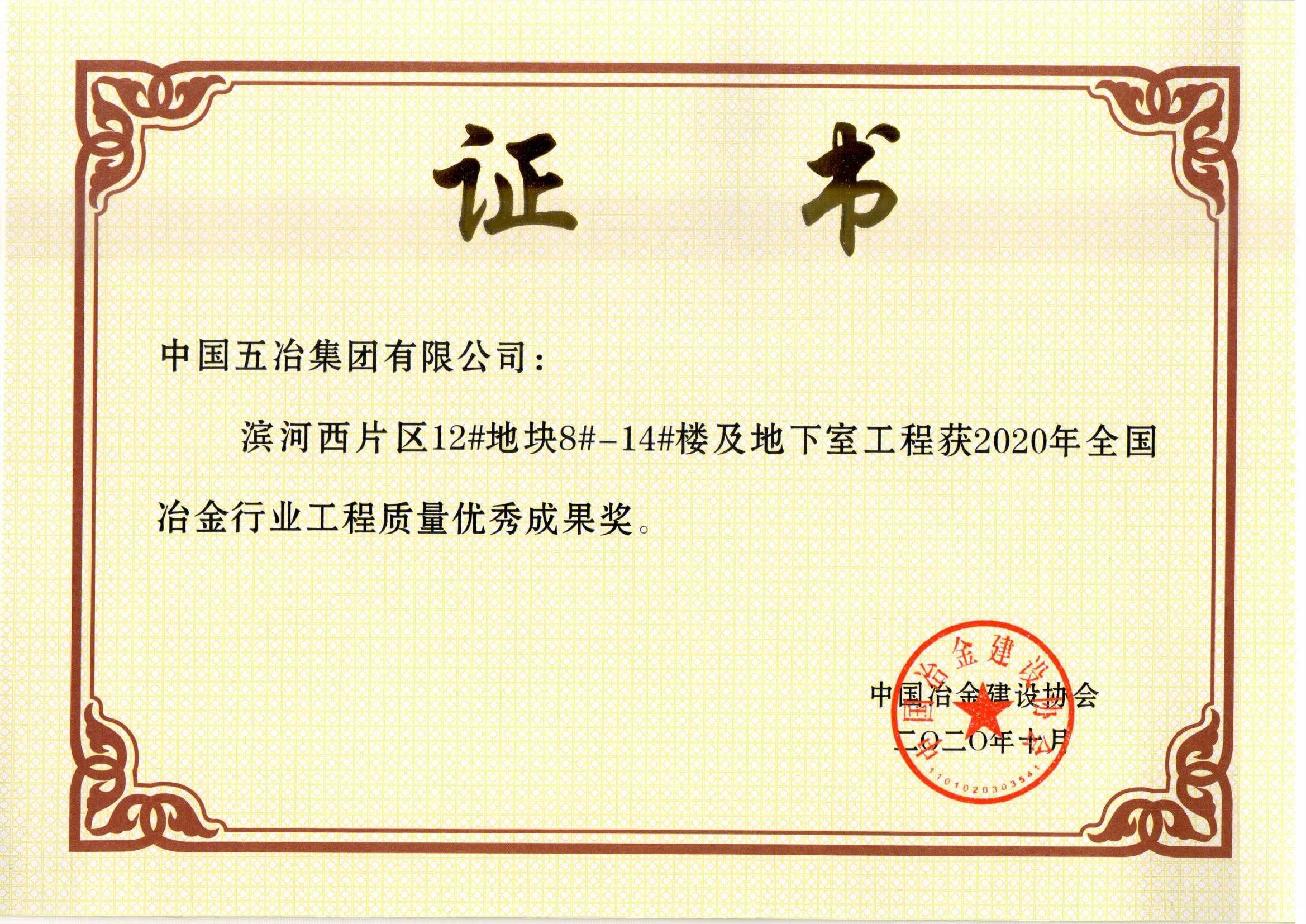 濱河西片區(qū)12#地塊8#-14#樓及地下室工程獲2020年全國(guó)冶金行業(yè)工程質(zhì)量?jī)?yōu)秀成果獎(jiǎng)