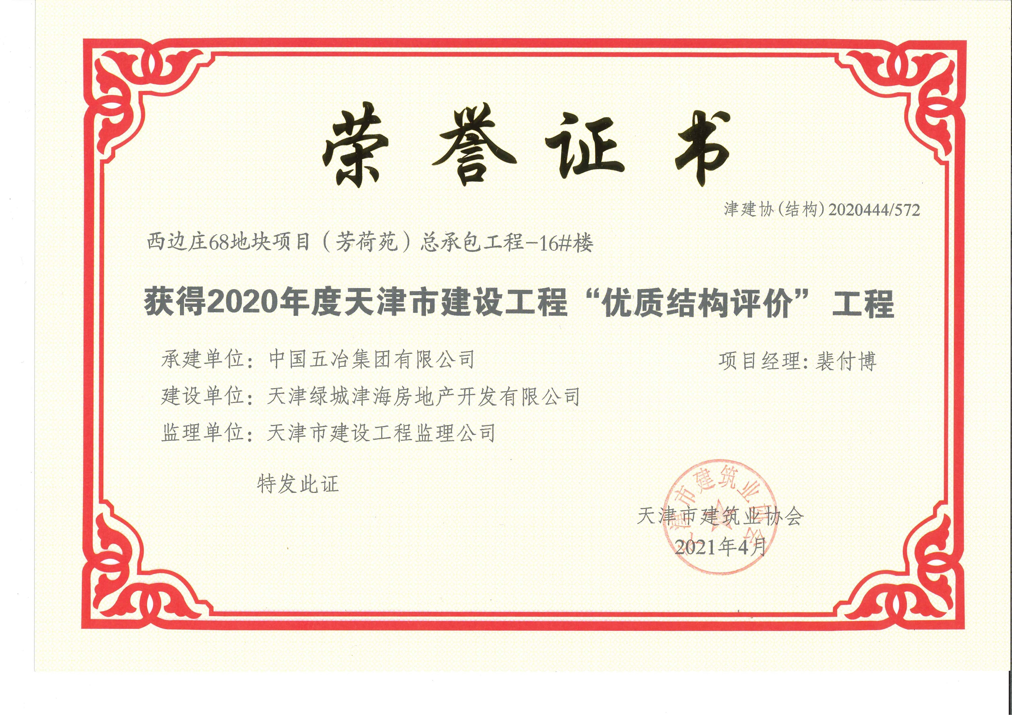 天津靜海綠城(西邊莊68地塊項目-芳荷苑總承包工程-16號樓)--2020年天津優(yōu)質(zhì)結構評價