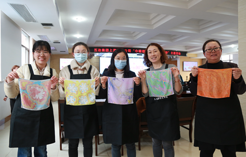 在水拓絲巾手工制作活動中感受文化遺產(chǎn)之美,并為女職工們送上“玫瑰陣”和祝福語。
