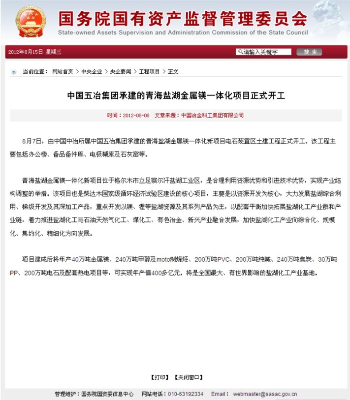 國資委報道:中國五冶集團承建的青海鹽湖金屬鎂一體化項目正式開工