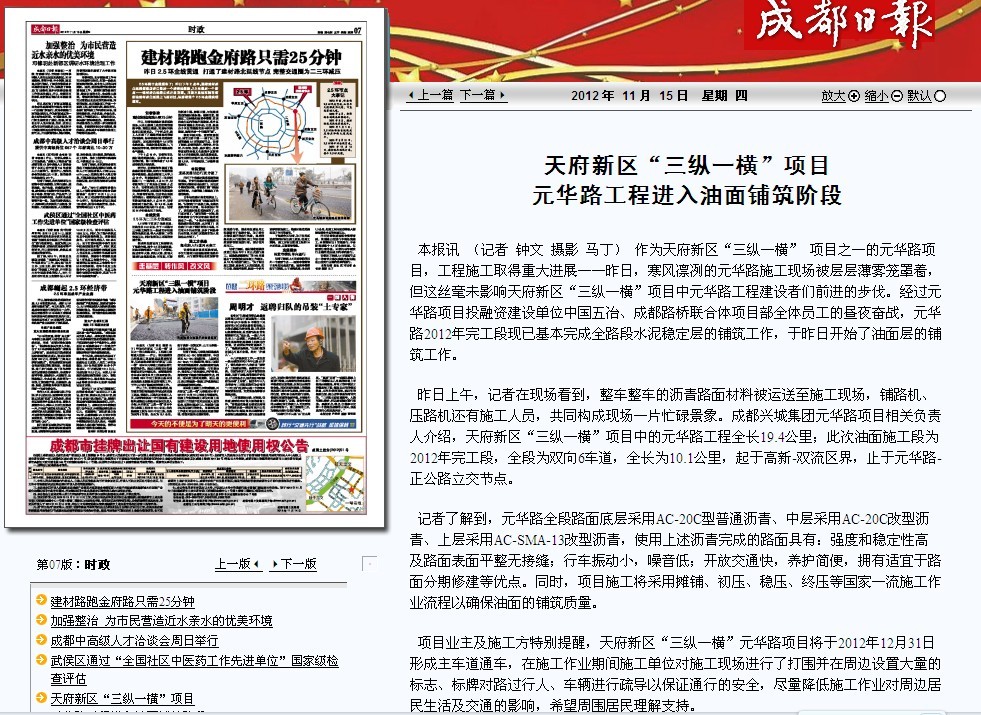 成都日報報道:天府新區(qū)“三縱一橫”項目 元華路工程進入油面鋪筑階段