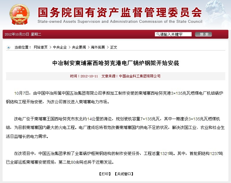 國資委報道:中冶制安柬埔寨西哈努克港電廠鍋爐鋼架開始安裝