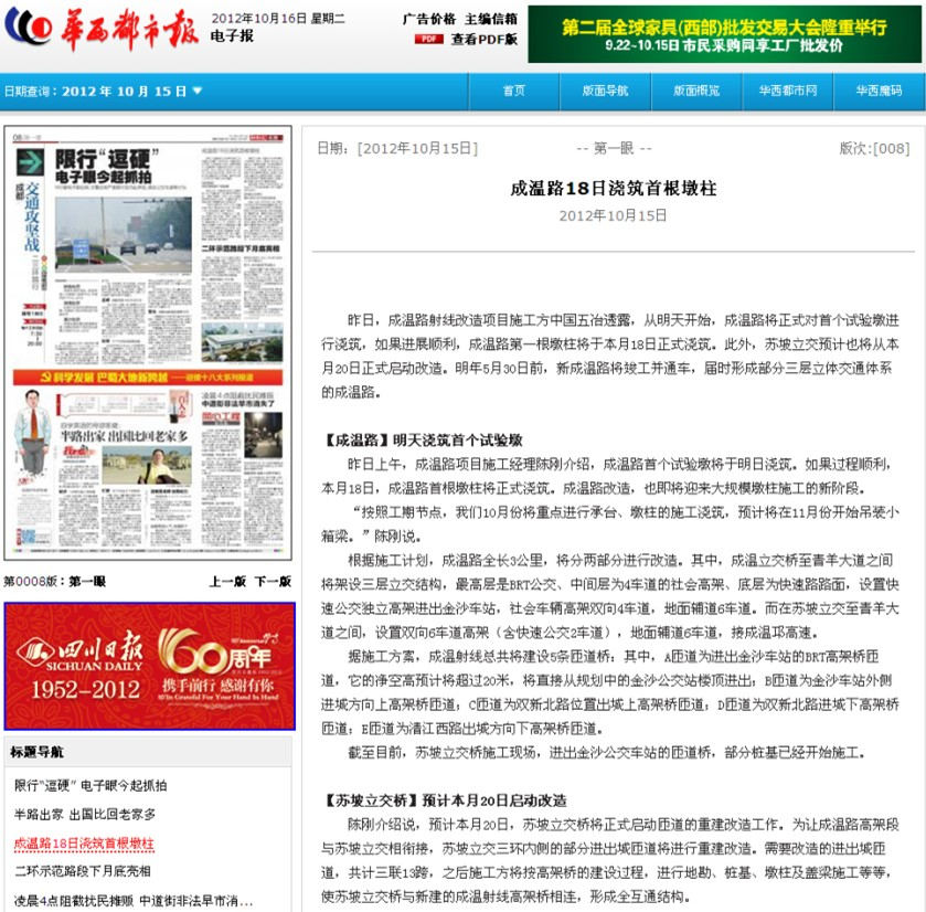 華西都市報報道:成溫路18日澆筑首根墩柱