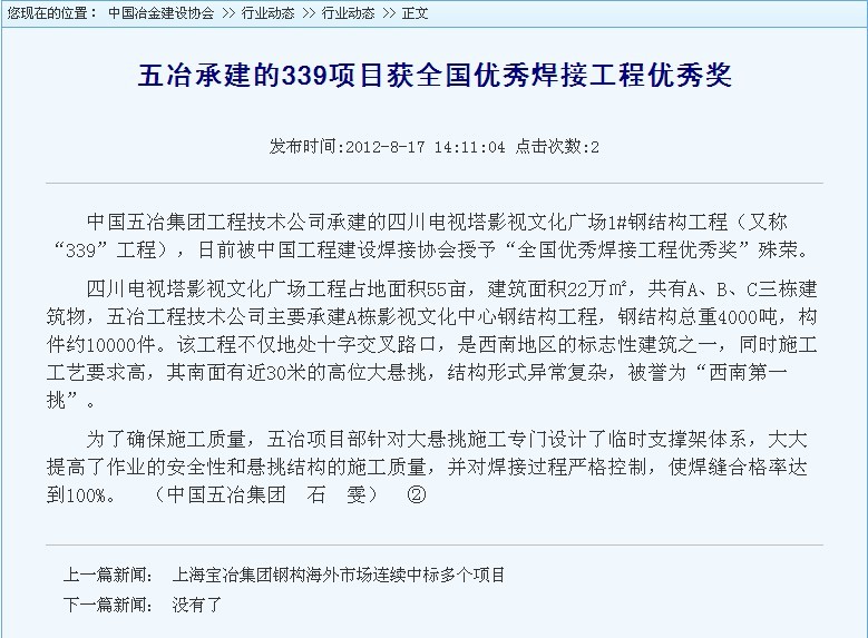 中國冶金建設協(xié)會網(wǎng)報道:五冶承建的339項目獲全國優(yōu)秀焊接工程優(yōu)秀獎