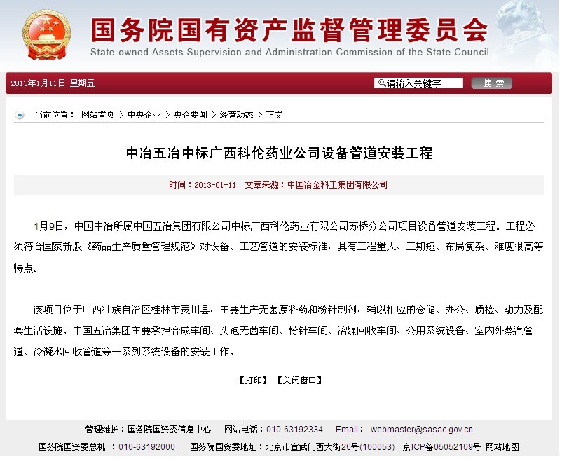 國資委報道:中冶五冶中標廣西科倫藥業(yè)公司設(shè)備管道安裝工程
