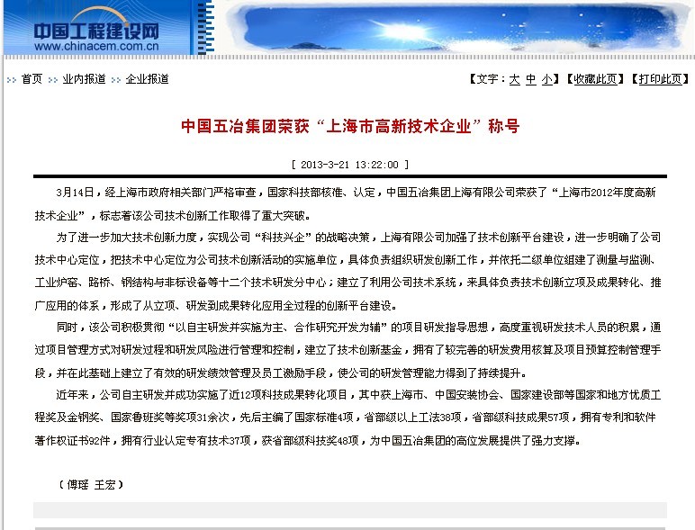 中國工程建設(shè)網(wǎng)報道:中國五冶集團(tuán)榮獲“上海市高新技術(shù)企業(yè)”稱號