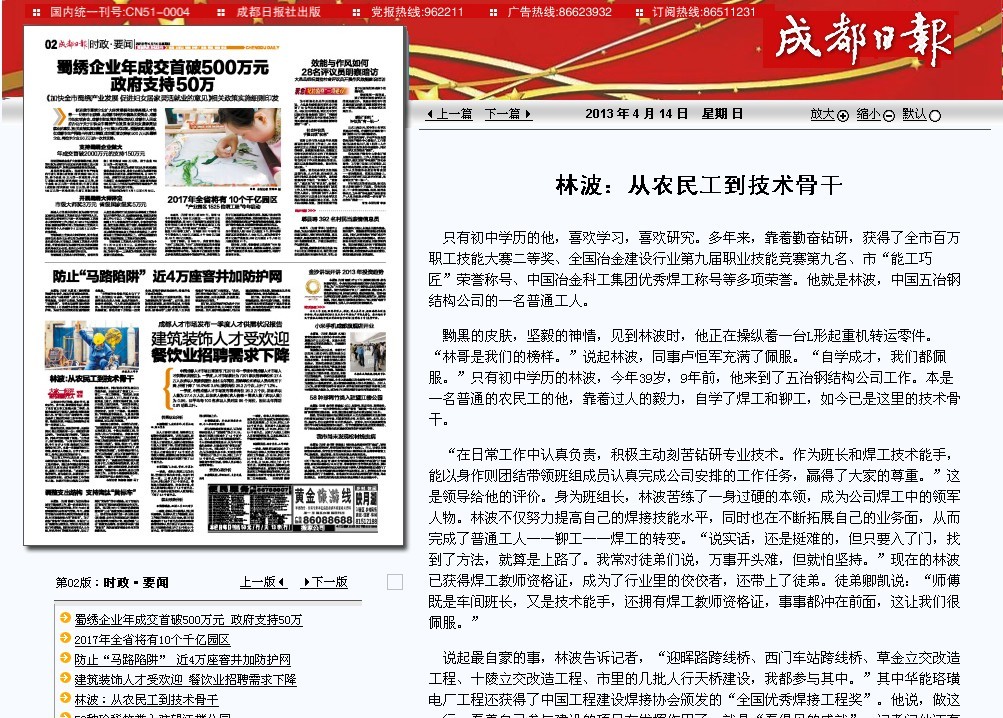 只有初中學(xué)歷的他,喜歡學(xué)習(xí),喜歡研究。多年來,靠著勤奮鉆研,獲得了全市百萬職工技能大賽二等獎、全國冶金建設(shè)行業(yè)第九屆職業(yè)技能競賽第九名、市“能工巧匠”榮譽(yù)稱號、中國冶金科工集團(tuán)優(yōu)秀焊工稱號等多項(xiàng)榮譽(yù)。他就是林波,中國五冶鋼結(jié)構(gòu)公司的一名普通工人。