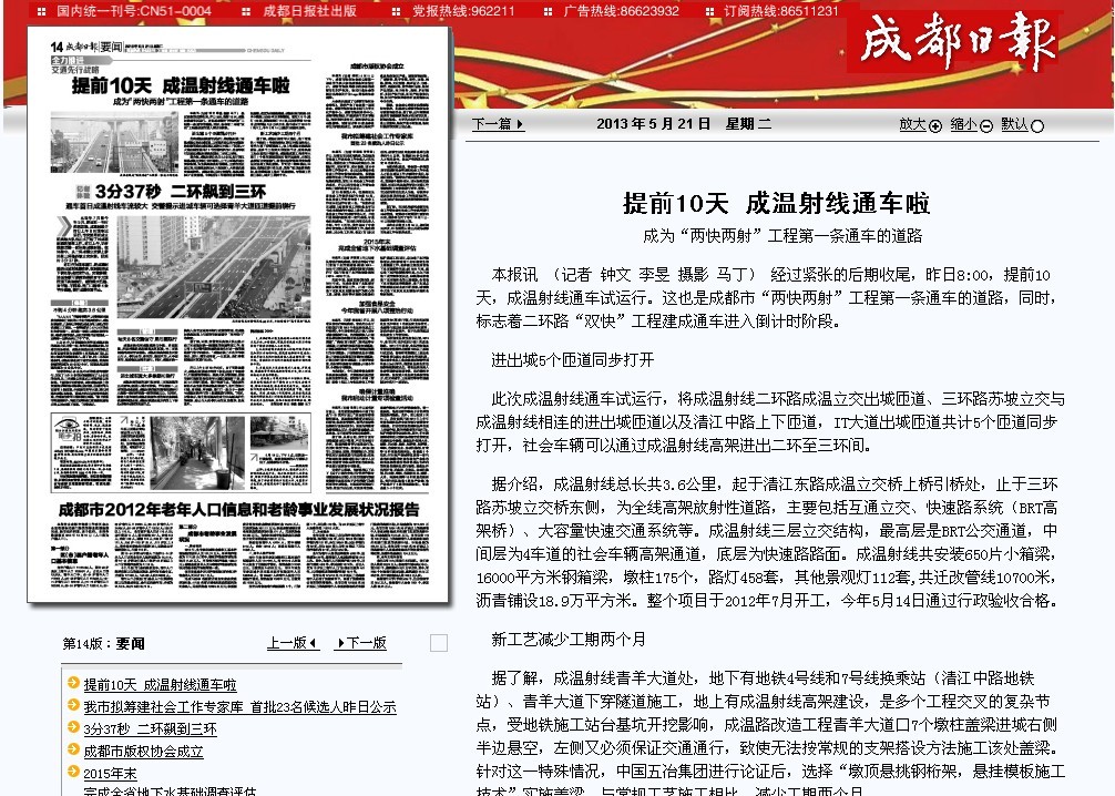 經(jīng)過緊張的后期收尾,昨日8:00,提前10天,成溫射線通車試運(yùn)行。這也是成都市“兩快兩射”工程第一條通車的道路,同時(shí),標(biāo)志著二環(huán)路“雙快”工程建成通車進(jìn)入倒計(jì)時(shí)階段。