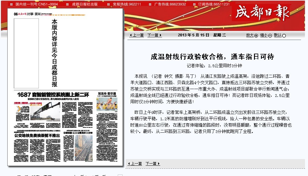 下一篇:天府早報(bào)報(bào)道:成溫路射線有望提前至月底通車