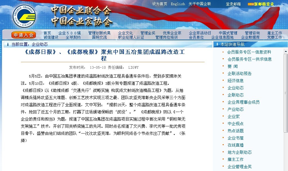 中國企業(yè)聯(lián)合會網(wǎng)報道:《成都日報》、《成都晚報》聚焦中國五冶集團(tuán)成溫路改...