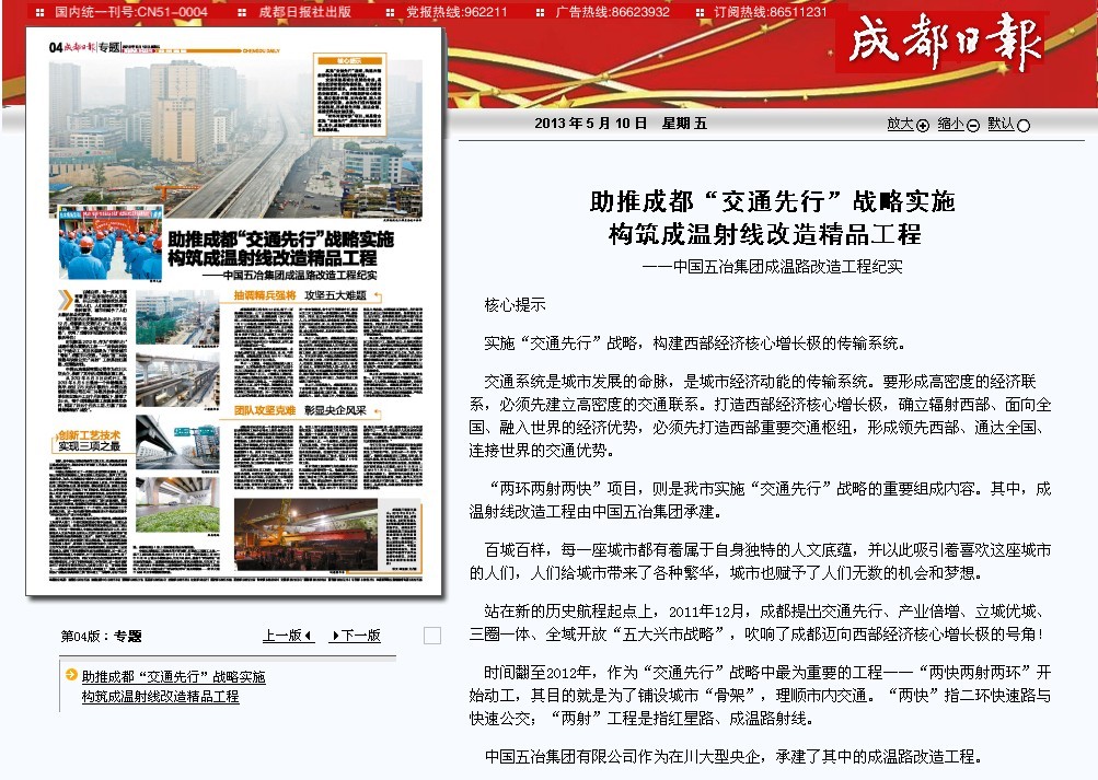 成溫路工程意義重大。2013年5月5日,包括《成都日報》、成都電視臺、《成都商報》、《成都晚報》等多家媒體聚焦于此,共同見證了成溫路改造工程達到實現(xiàn)全面通車條件的目標。看著一條嶄新筆直的大道宛如雨后彩虹一般架設在空中,中國五冶集團竭盡全力,用辛勤的汗水履行了屬于央企的社會責任,力促成都地方經(jīng)濟社會的發(fā)展!