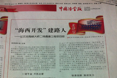 5月1日,《中國(guó)冶金報(bào)》第八版發(fā)表題為《“海西開發(fā)”建路人——記五冶海峽大橋二線通道工程項(xiàng)目部》的報(bào)道,報(bào)道了中國(guó)五冶集團(tuán)海峽大橋二線通道工程項(xiàng)目部,榮獲中華全國(guó)總工會(huì)授予的“全國(guó)工人先鋒號(hào)”榮譽(yù)稱號(hào),在整個(gè)工程中的勇于拼搏、善于創(chuàng)新精神。