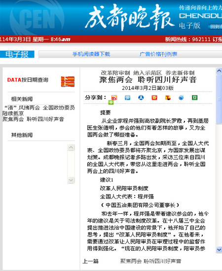 3月2日,《成都晚報》以“聚焦兩會?聆聽四川好聲音”為題,報道了全國人大代表、中國五冶集團(tuán)董事長、黨委書記程并強(qiáng),對如何改革人民陪審員制度提出了自己的建議。