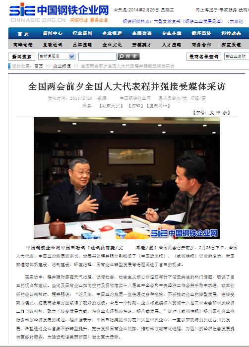 中國鋼鐵企業(yè)網(wǎng)報道:全國兩會前夕全國人大代表程并強接受媒體采訪