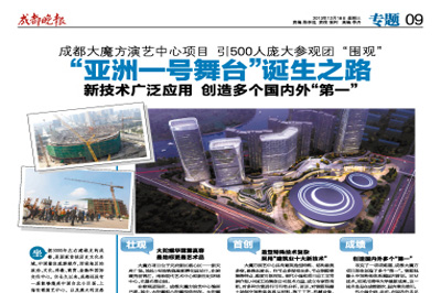 成都晚報對此進行了全過程的跟蹤報道,并在12月18日發(fā)行的成都晚報中進行了整版宣傳報道。報道指出:成都大魔方項目是一個擁有世界一流,國際領(lǐng)先水平的演藝兼容體育賽事的大型現(xiàn)代化場館項目;是一個擁有六大超級業(yè)態(tài)價值鏈有效疊加,相得益彰,素質(zhì)一流的大型城市綜合體項目;是一個占盡成都高端資源配套和絕版核心地段的文化產(chǎn)業(yè)商業(yè)地產(chǎn)項目。歷史賦予了它承擔現(xiàn)代文明城市精神圖騰和文化地標的使命!在成都大魔方項目實施中,中國五冶創(chuàng)造了多個國內(nèi)外“第一”,在成都的工程建設(shè)中,寫下了濃墨重彩的一筆,這也贏得成都建設(shè)部門及行業(yè)的一致稱道。(譚波瀾)