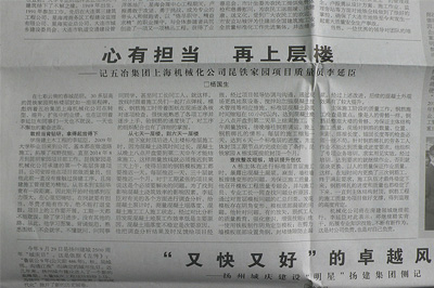 11月16日,《建筑時(shí)報(bào)》第3版,發(fā)表人物通訊《心有擔(dān)當(dāng),再上層樓》,報(bào)道中國(guó)五冶集團(tuán)上海有限機(jī)械化公司優(yōu)秀員工李延臣的先進(jìn)事跡。
