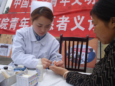 志愿者為患者做免費(fèi)血糖監(jiān)測(cè)