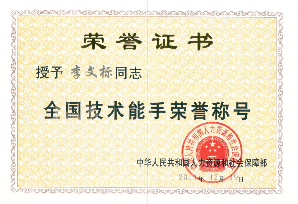 ????? 2014年12月19日,李文標同志榮獲國家人力資源社會保障部“全國技術(shù)能手”稱號。