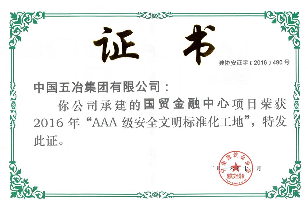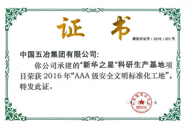 ? ?2016年12月,中國五冶集團(tuán)新華之星”科研生產(chǎn)基地工程項(xiàng)目和國貿(mào)金融中心工程項(xiàng)目榮獲2016年全國“AAA級安全文明標(biāo)準(zhǔn)化工地”稱號。