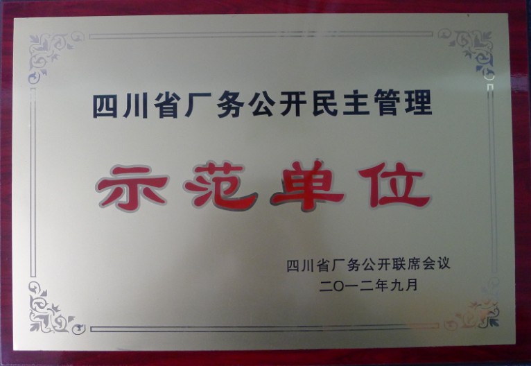 2012年9月,中國五冶集團在四川省創(chuàng)建廠務(wù)公開民主管理示范單位活動中,榮獲四川省“廠務(wù)公開民主管理”示范單位稱號。