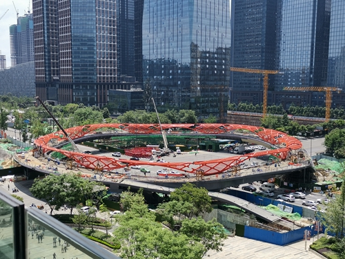 該項目位于成都市高新區(qū)益州大道路口,屬交子金融大街形象提升工程中的重點項目。中國五冶集團主要承建該項目的鋼結(jié)構(gòu)制安部分,屬異形空間結(jié)構(gòu),是整個施工環(huán)節(jié)技術(shù)含量最高,難度最大的部分。交子之環(huán)內(nèi)直徑90米,外直徑110米,主要包括結(jié)構(gòu)環(huán)、交通環(huán)和風(fēng)雨環(huán)廊三部分,工程量約3500噸。