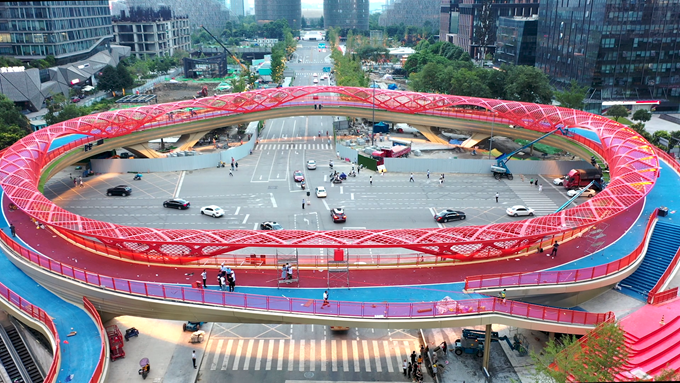 以高顏值爆紅的“交子之環(huán)”景觀橋,由結(jié)構(gòu)環(huán)、交通環(huán)和風(fēng)雨環(huán)廊三部分構(gòu)成。寬達(dá)10米、周長300米的橋面將陸續(xù)呈現(xiàn)通行、休閑、表演、運(yùn)動等場景,使其成為全國首座擁有多元場景的人行天橋。