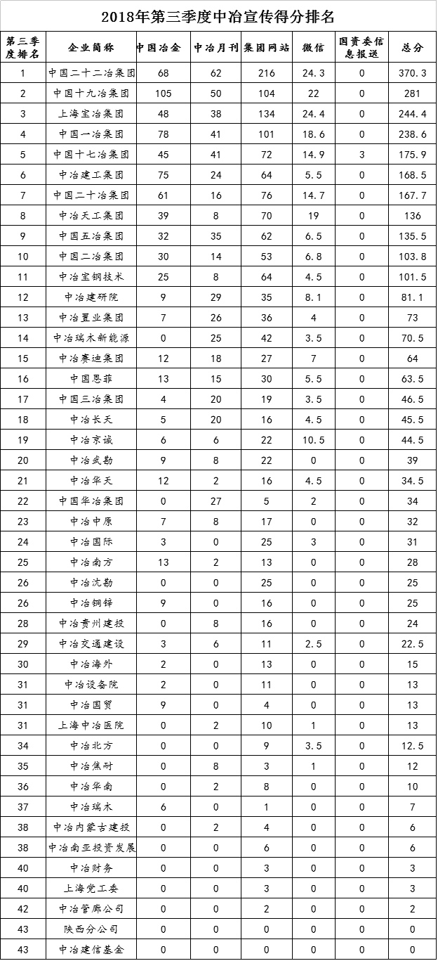 2018年第三季度中冶集團宣傳得分排名