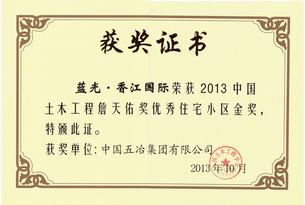 ????2013年10月,中國五冶集團有限公司藍光·香江國際項目榮獲2013年度中國土木工程詹天佑獎優(yōu)秀住宅小區(qū)金獎。