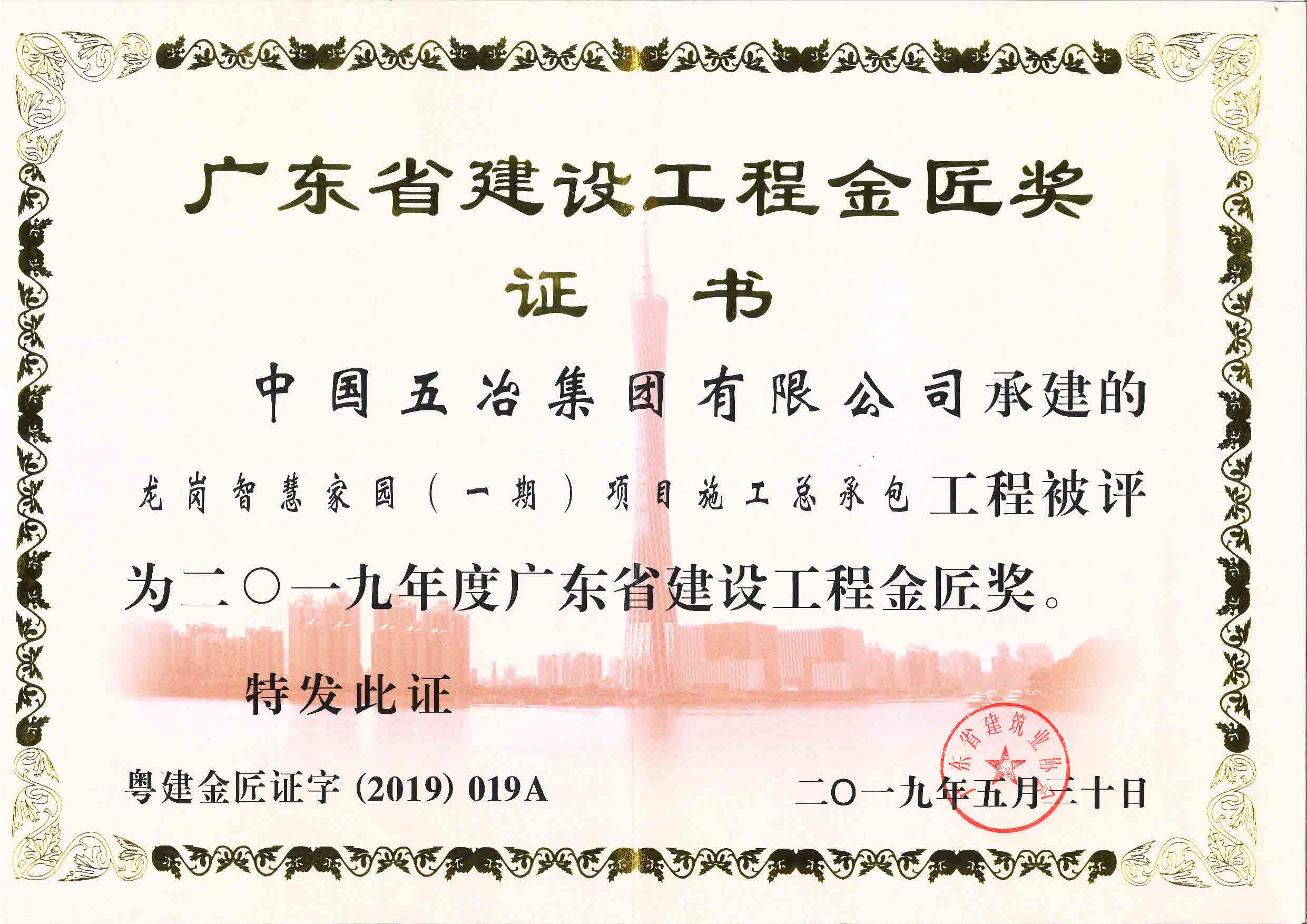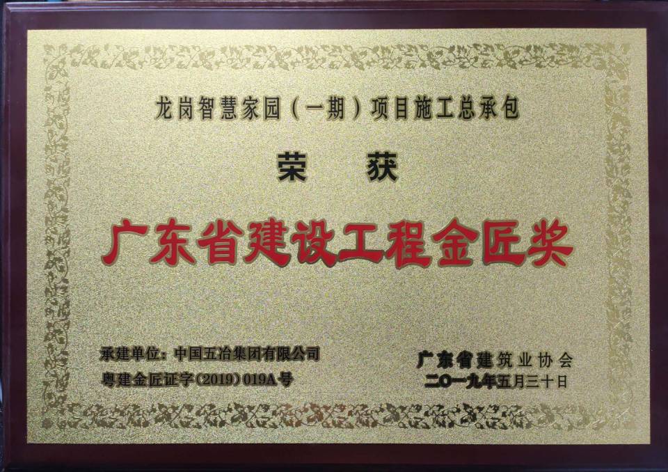 龍崗智慧家園(一期)項目施工總承包工程被評定為二〇一九年度廣東省建設(shè)工程金匠獎