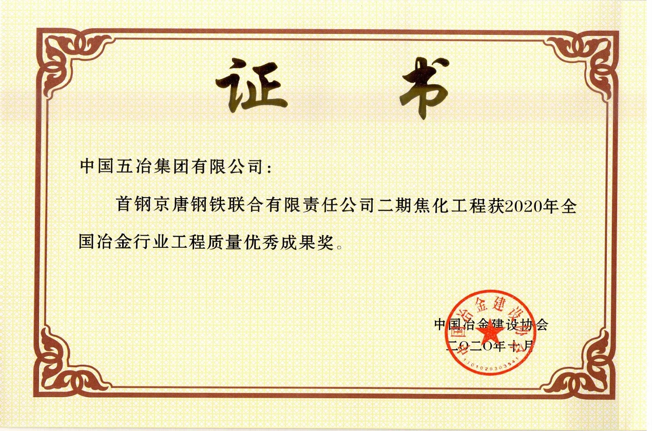 首鋼京唐鋼鐵聯(lián)合有限責任公司二期焦化工程榮獲2020年全國冶金行業(yè)工程質量優(yōu)秀成果獎