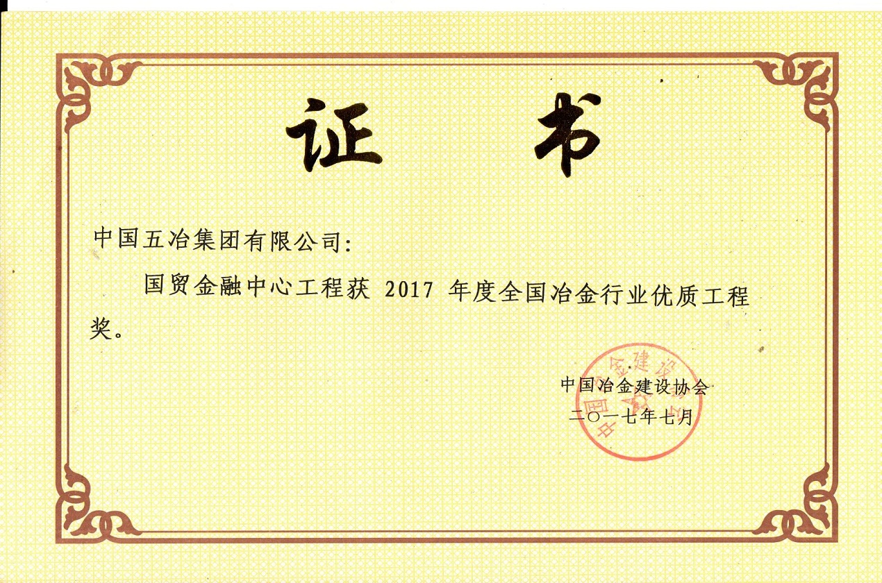 國(guó)貿(mào)金融中心工程獲2017年度全國(guó)冶金行業(yè)優(yōu)質(zhì)工程獎(jiǎng)