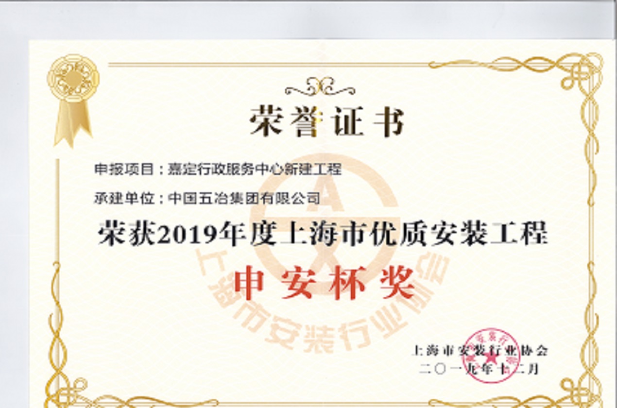 嘉定服務中心項目——2019年上海市優(yōu)質(zhì)安裝工程“申安杯”獎