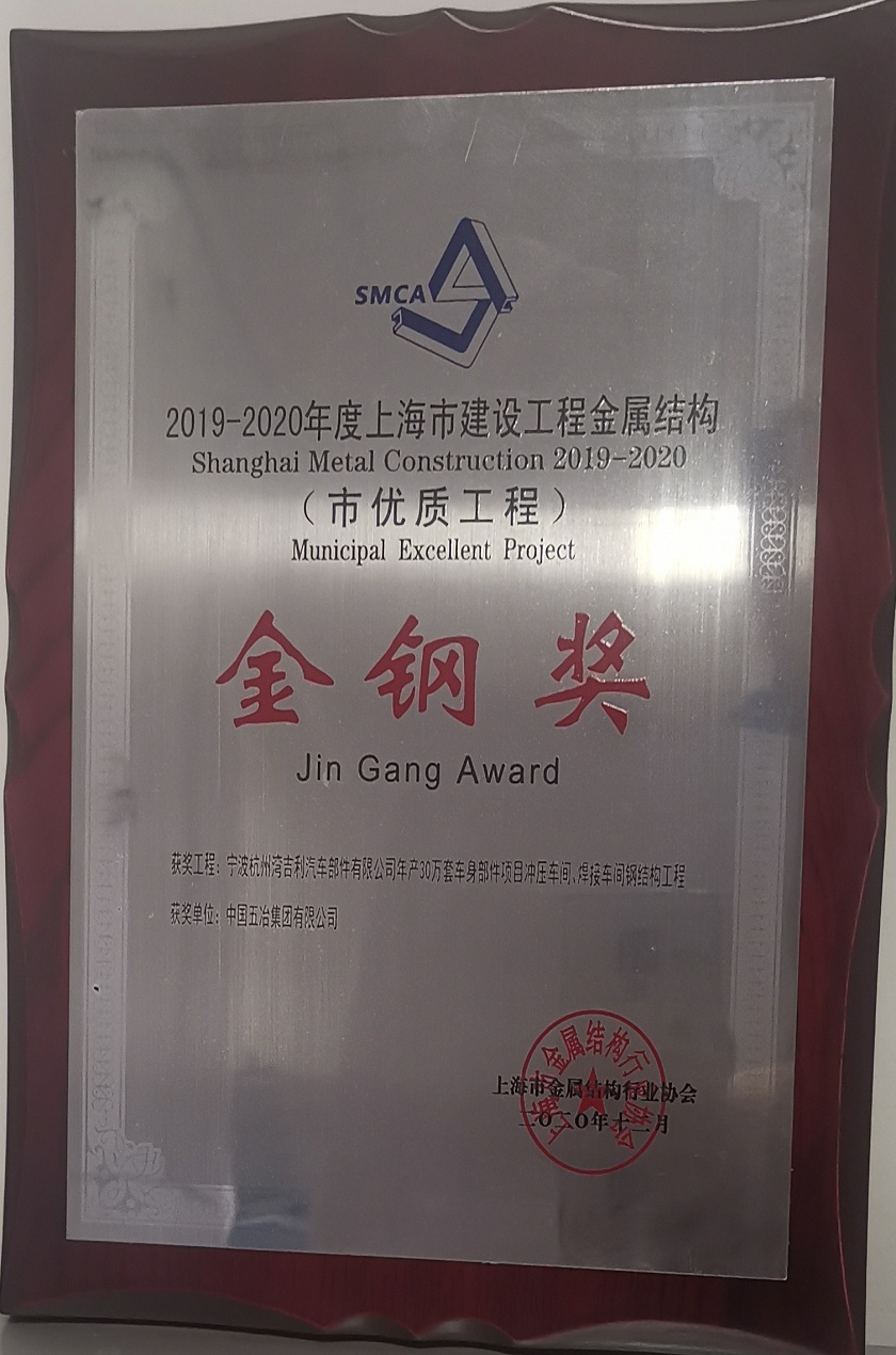 寧波杭州灣吉利汽車部件有限公司年產(chǎn)30萬套車身部件項(xiàng)目標(biāo)準(zhǔn)車間鋼結(jié)構(gòu)工程獲2019-2020年度第二批上海市建設(shè)工程金屬結(jié)構(gòu)“金鋼獎(jiǎng)”(市優(yōu)質(zhì)工程)