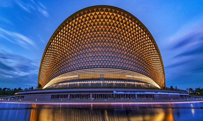 公園核心主舞臺雙面劇場建筑,形似鳳凰展翅,集空間桁架與拱支雙曲拋物面索網(wǎng)兩獨立復雜結構為一體,擁有超萬平方米的可投影天幕,是世界最大的全景聲天幕,可滿足5千到4.7萬人不同規(guī)模觀演需求;主舞臺幕墻呈“鳳羽”肌理特征,由 1734 塊節(jié)點不共面異形四棱錐鋁板構成,形成曲線流暢、肌理鮮明、光影豐富的立面效果。