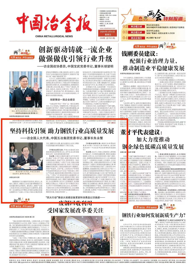 2024年全國兩會期間,全國人大代表,中國五冶集團(tuán)黨委書記、董事長朱永繁接受多家權(quán)威主流媒體專訪,積極履職建言獻(xiàn)策,實(shí)事求是講述五冶高質(zhì)量發(fā)展情況。3月8日,《中國冶金報》頭版以《堅持科技引領(lǐng) 助力鋼鐵行業(yè)高質(zhì)量發(fā)展》為題刊發(fā)對朱永繁代表的專訪報道,現(xiàn)對報道進(jìn)行全文轉(zhuǎn)發(fā)。
