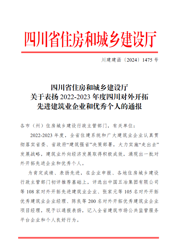 近日,四川省住房和城鄉(xiāng)建設(shè)廳印發(fā)《關(guān)于表?yè)P(yáng)2022-2023 年度四川對(duì)外開(kāi)拓先進(jìn)建筑業(yè)企業(yè)和優(yōu)秀個(gè)人的通報(bào)》,中國(guó)五冶集團(tuán)榮獲多項(xiàng)表彰。