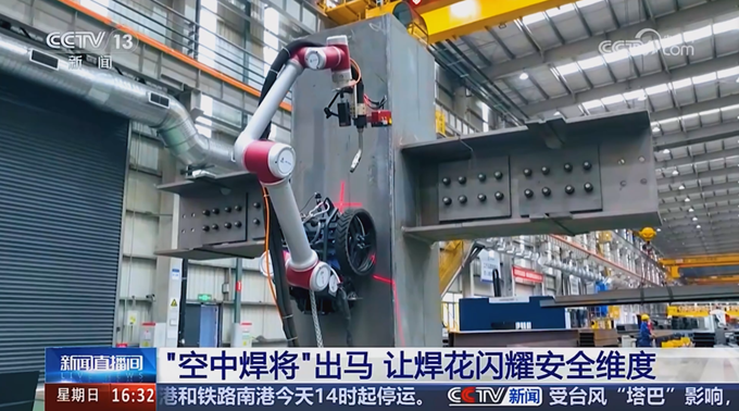 央視報(bào)道指出:中國五冶集團(tuán)自主研制的高空焊接機(jī)器人就像一個(gè)全能的“空中焊將”,有了它,高空場景的焊接作業(yè)不再讓人提心吊膽,效率也更高,這就是智能機(jī)器人帶來的科技推動(dòng)力。