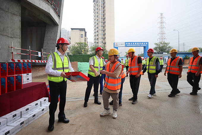 朱永繁董事長一行先后走進錦官花城綜合體、龍泉東洪片區(qū)開發(fā)項目現(xiàn)場,詳細(xì)了解工程概況、工期進度、策劃編制及執(zhí)行、履約管理等方面情況,向節(jié)日期間堅守崗位、辛勤工作的各位員工、合作伙伴、廣大工友表示敬意和感謝,并送上月餅、牛奶、零食、生鮮等慰問品,祝福大家國慶中秋雙節(jié)快樂,叮囑大家安排好節(jié)日期間的工作和生活。