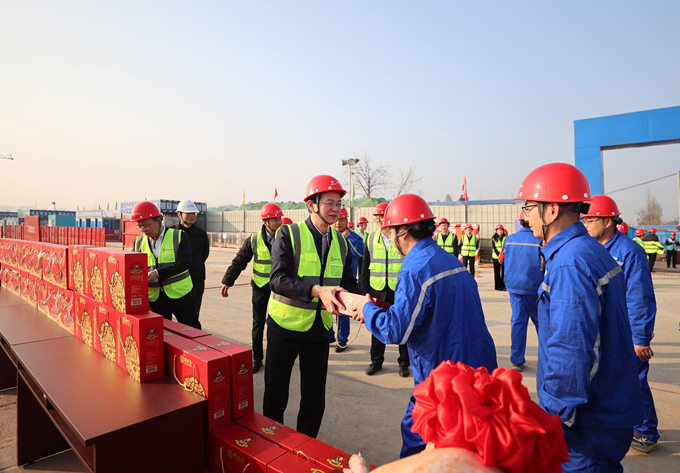 2月21日正月初五,中國五冶集團(tuán)黨委書記、董事長朱永繁,黨委副書記、總經(jīng)理張剛一行前往成都市西河污水處理三廠建設(shè)項(xiàng)目和中國五冶集團(tuán)(成都)建筑科技產(chǎn)業(yè)園,看望慰問堅(jiān)守在生產(chǎn)一線的員工,為他們送去新春祝福和豬肉、牛奶、面包、方便面、水果、堅(jiān)果零食等節(jié)日慰問品,并開展帶班檢查。