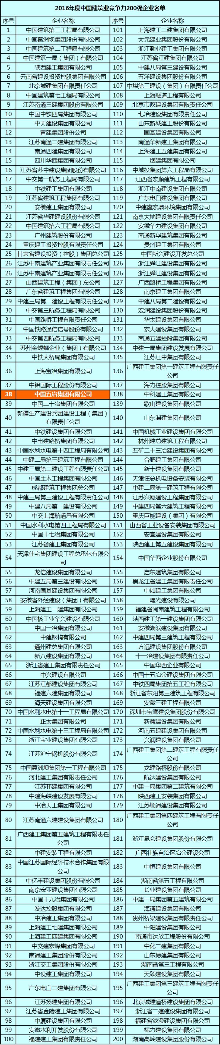 8月23日,中國(guó)建筑業(yè)協(xié)會(huì)公布了2016年度中國(guó)建筑雙200強(qiáng)企業(yè)評(píng)價(jià)結(jié)果。中國(guó)五冶集團(tuán)再次入圍中國(guó)建筑業(yè)雙200強(qiáng)企業(yè)名單,位列競(jìng)爭(zhēng)力200強(qiáng)企業(yè)名單第38位,比上年前進(jìn)11位。