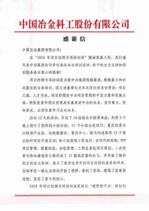 感謝信表示,培訓(xùn)工作的圓滿完成凝聚了中國(guó)五冶員工的心血和汗水,中國(guó)五冶與集團(tuán)工程建設(shè)管理部、人力資源部攜手完成此次任務(wù),經(jīng)受住了籌備工作時(shí)間緊、任務(wù)重、要求嚴(yán)的考驗(yàn)。這份榮譽(yù),屬于和我們一起奮斗過的所有參與者!