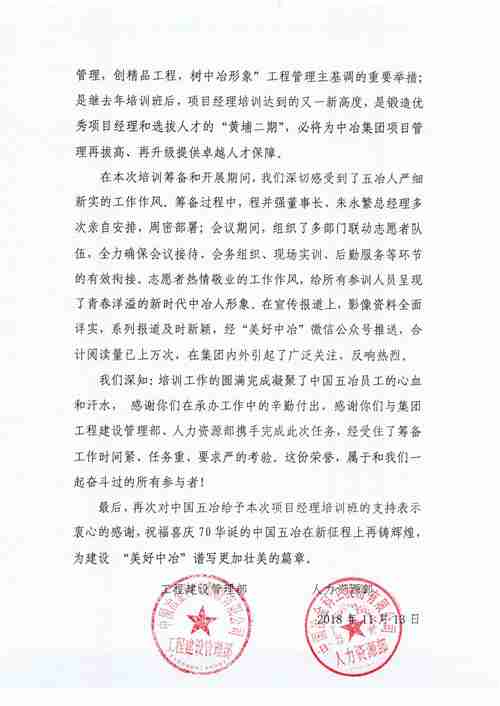 11月13日,中國(guó)冶金科工股份有限公司工程建設(shè)管理部、人力資源部向中國(guó)五冶發(fā)來感謝信,對(duì)公司在承辦中冶集團(tuán)2018年項(xiàng)目經(jīng)理專項(xiàng)培訓(xùn)活動(dòng)過程中展現(xiàn)的嚴(yán)細(xì)新實(shí)的工作作風(fēng)表示肯定。