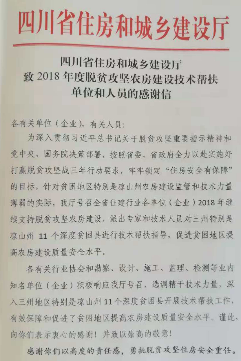 《感謝信》表示,感謝你們以高度的責(zé)任感,勇挑脫貧攻堅(jiān)住房安全重任。在2016年、2017年對(duì)涼山州脫貧攻堅(jiān)農(nóng)房建設(shè)技術(shù)幫扶支持的基礎(chǔ)上,再次組織和選調(diào)技術(shù)骨干,組成技術(shù)幫扶組駐守深度貧困縣,展現(xiàn)了住建行業(yè)模范企業(yè)的擔(dān)當(dāng)和風(fēng)采,發(fā)揮了行業(yè)榜樣的作用。感謝你們竭盡全力攻堅(jiān)克難,與廣大貧困群眾同心同行確保安全。你們派駐的專家和專業(yè)技術(shù)人員走村寨、訪農(nóng)戶,深入脫貧攻堅(jiān)農(nóng)房建設(shè)現(xiàn)場(chǎng),吃苦耐勞、盡職盡責(zé),有效幫助地方完善農(nóng)房質(zhì)量安全監(jiān)管體系,培訓(xùn)指導(dǎo)建房工匠,及時(shí)發(fā)現(xiàn)質(zhì)量安全問(wèn)題并指導(dǎo)各方責(zé)任主體落實(shí)整改,為保障三州脫貧攻堅(jiān)農(nóng)房建設(shè)質(zhì)量安全做出了貢獻(xiàn)。