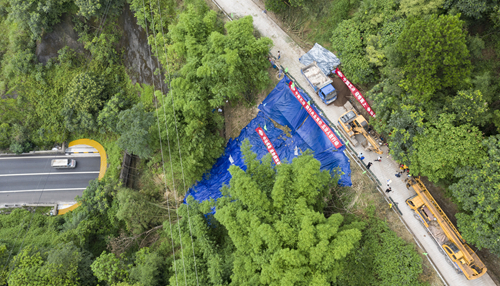 接到重慶市江北區(qū)規(guī)劃和自然資源局任務(wù)委托后,成勘公司立即集合精兵強將,連夜奔赴現(xiàn)場搶險。第一時間到達(dá)指定位置后,搶險項目團(tuán)隊立即在滑塌區(qū)周邊采取斷道措施,設(shè)置警戒標(biāo)志,確保行人安全,并對滑塌體表層的石塊及樹木進(jìn)行細(xì)致清理,疏通滑坡體后側(cè)公路長約60米的水溝,同時在現(xiàn)有公路外側(cè)修筑5厘米高的混凝土擋塊,防止地表水從公路內(nèi)側(cè)溢出到滑體后側(cè),利用防水布將現(xiàn)有滑塌體及其臨近一定的區(qū)域進(jìn)行遮蓋,防止雨水進(jìn)入誘發(fā)二次滑塌。